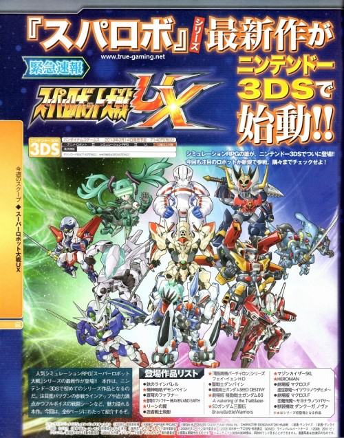 عدد هذا الأسبوع من مجلة فاميتسو اليابانية قام بالكشف عن لعبة Super Robot Taisen UX للننتندو 3DS والمقرر إصدارها بشهر مارس من العام القادم في اليابان، إليكم سكانات المجلة: