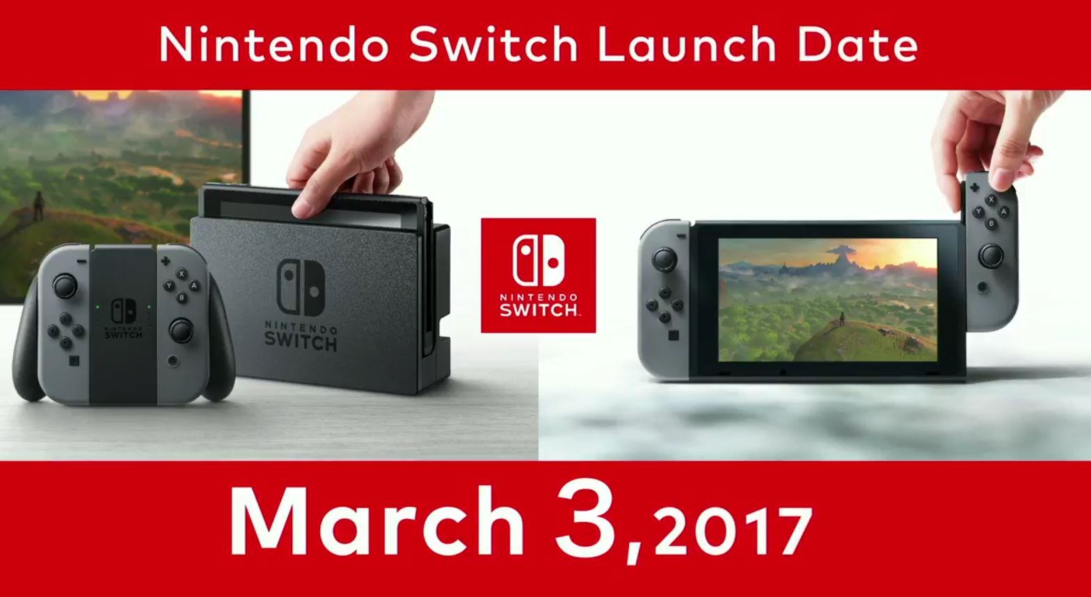 من خلال حدث الكشف الرسمي الكامل عن الـNintendo Switch وسيصدر الجهاز في الـثالث من مارس المقبل بشكل متزامن في مختلف الأسواق العالمية الضخمة. سعر الجهاز سيكون 299 دولار في أمريكا الشمالية وسيعتمد على المتجر الذي تقومون بالشراء منه في أوروبا.