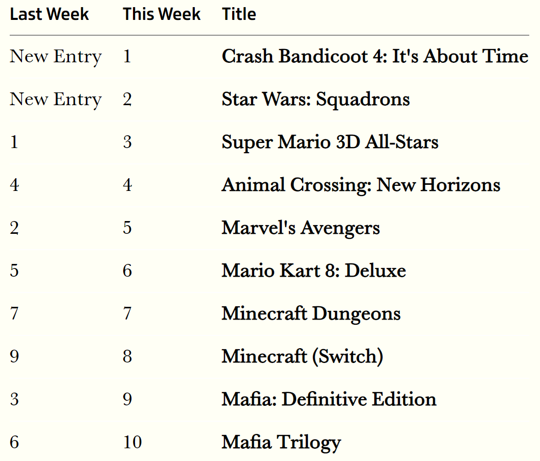 هذا الأسبوع يشهد صدورلعبتين رئيسية بالأسواق العالمية وهما Crash Bandicoot 4 من اكتفجين و Star Wars Squadrons من شركة EA وإنعكس ذلك على آداء اللعبتين بقوائم المبيعات من خلال منافسه شرسه بينهم على مركز الصدارة إنتهى بتفوق لعبة كراش على منافستها وبفارق 1000 نسخة إضافية مباعه فقط.