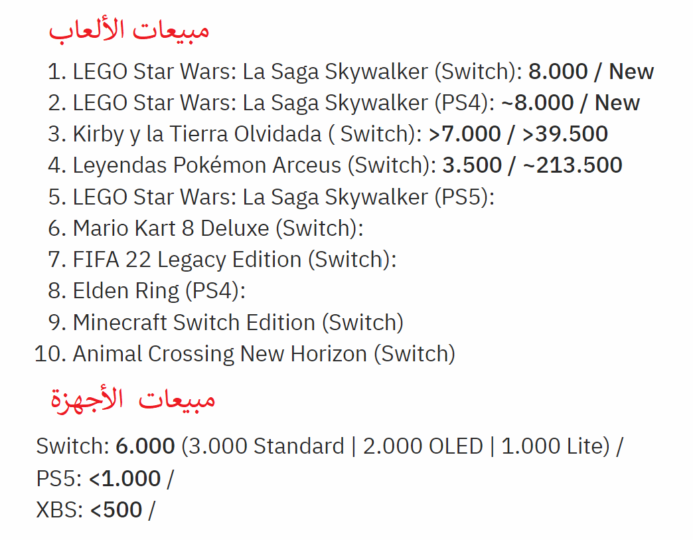 ألعاب ننتندو المعتادة متواجدة بالقائمة ومع تفوق جهاز الننتندو سويتش على المنافسين بشكل كبير بالمبيعات بـ6 آلاف وحدة بينما تواجه أجهزة الجيل الحالي المنزلية نقصا بالشحنات هذا الأسبوع ينعكس بشكل واضح على مبيعاتها بـ1000 وحدة للبلايستيشن5 و 500 وحدة للاكس بوكس سيريس: